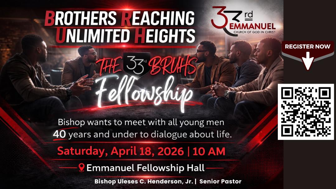 On Saturday, April 18th at 10am, the BRUHS Fellowship will meet here at Emmanuel in the dining hall. BRUHS stands for Brothers Reaching Unlimited Heights. All men under the age of 40 are invited for a special time of fellowship and breakfast with our Pastor, Bishop Henderson. Please register by April 15, 2026 by scanning the QR code.