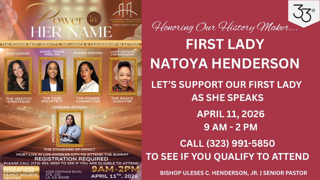 Let's support our First Lady at the Power in her Name Women’s Leadership and Empowerment Summit on Saturday, April 11, 2026, from 9am-2pm (her segment is at 12:30pm). Registration is required and attendees must be residents of the city of Los Angeles; see flyer for details. We thank God for our wonderful First Lady!